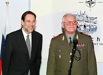 После подписания в Париже в мае 1997 года «Основополагающего акта Россия — НАТО о взаимных отношениях, сотрудничестве и безопасности»[18] был создан Совместный постоянный совет (СПС). Встречи Совета проходили в двустороннем формате «НАТО+1»[19]. Этим документом альянс принял обязательство не размещать войска вдоль российских границ на постоянной основе. «Основополагающий акт» и подписанная в 2001 году Римская декларация «Отношения Россия — НАТО: новое качество» предусматривали учреждение отдельного российского представительства при НАТО, включая аппарат Главного военного представителя и Группу связи при штабе Стратегического командования операций ОВС НАТО, а в Москве — Информационного бюро и Военной миссии связи НАТО[20].