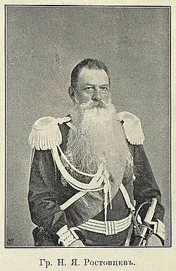 Граф (с 23.04.1861) Николай Яковлевич Ростовцев (1831, Санкт-Петербург — 1897, Самарканд) — генерал-лейтенант, Самаркандский губернатор.