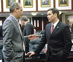 13 сентября 2005 года, в возрасте 34 лет, Рубио стал спикером Палаты представителей Флориды[31]. Он вступил в должность в ноябре 2006 года, став первым американцем кубинского происхождения, занявшим этот пост, и оставался спикером до ноября 2008 года[32].