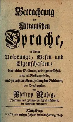 - 1745: «Betrachtung der Littauischen Sprache, in ihrem Ursprunge, Wesen und Eigenschaften»