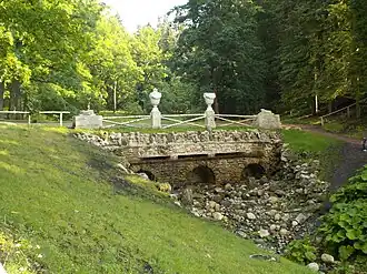 На постаментах перил каскада установлены вазы, по углам — фигуры львов[2] из пудостского известняка[1], и те, и другие специально полуразрушены. Основная ограда сделана из неровных стволов молодых берёз[2].