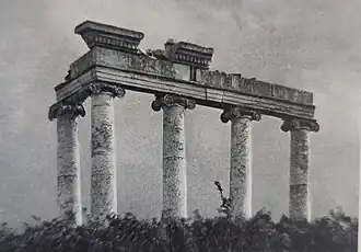 Руинный пруд был создан М. И. Пилсудским в 1851 году, а в 1852 году А. И. Штакеншнейдер получил указание создать сооружение из оставшегося после постройки Михайловского замка мрамора (по проекту Николая I, уточнённому архитектором[1]). Летом того же года[2] за десять дней[1] при участии Ф. Чернягина и П. Вельти было установлено сооружение: высокие[2] ионические[1] колонны из тивдийского мрамора, перекрытые архитравом, фризом и частью карниза, на гранитном цоколе; несколько колонн стояли отдельно, вокруг на склонах были помещены статуи и четыре барельефа, имитирующие древнегреческие[2].