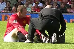 29 апреля 2006 года Руни получил травму в концовке матча английского чемпионата против «Челси». После медицинского обследования выяснилось, что нападающий получил перелом плюсневой кости стопы в столкновении с Паулу Феррейрой и его участие в чемпионате мира 2006 года находится под вопросом[255]. Культовый статус Руни и его ключевая роль в национальной сборной сделали из его восстановления от травмы целую эпопею, активно освещаемую английской прессой[256][257]. Пропустив первый групповой матч чемпионата мира против Парагвая, Руни смог выйти на замену во втором групповом матче сборной против Тринидада и Тобаго[258], а третью групповую игру против Швеции Уэйн начал в стартовом составе вместе с партнёром по атаке Майклом Оуэном[259]. Чемпионат мира оказался неудачным для Руни и для его сборной: в четвертьфинальном матче против Португалии Уэйн был удалён за грубую игру против Рикарду Карвалью, а Англия покинула турнир, уступив португальцам в серии послематчевых пенальти[260].