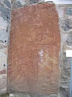 В настоящее время камень вмурован снаружи в стену алтарного выступа с южной стороны храма. Материал — розовый песчаник. Высота 2,29 м, ширина 1,40 м. Первое упоминание о камне относится к 1699 г. Вероятно первоначально памятник стоял на церковном кладбище, затем был перенесен внутрь церкви, где до 1829 г. использовался в качестве алтаря, а потом переложен на пол. В 1856 г. занял своё теперешнее место в церковной стене. Орнамент монумента достаточно простой. Текст высечен на туловище змея, которое образует петлю по контуру плиты. Голова и хвост змея внизу соединяются связкой. В центре изображен крест. Для придания камню подходящей для алтаря формы его правая сторона и нижняя часть были обколоты, вследствие чего часть надписи была утрачена. При транслитерации рунической надписи в тексте выделены: квадратными скобками [ ] — утерянные, но восстанавливаемые символы, круглыми скобками () — вероятное чтение поврежденных знаков.