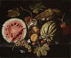 ![]() Натюрморт Дж.Б. Руопполо «Фрукты и птица на фоне пейзажа», Бостон. | |