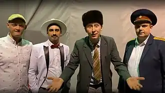 - ↑ КВН Русская дорога - 2014 Центральная Международная Лига Четвертая 1/8 Приветствие на YouTube