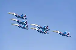 «Ру́сские ви́тязи» — авиационная группа высшего пилотажа Военно-воздушных сил России. Обладатель ряда мировых рекордов[1]. Была сформирована 5 апреля 1991 года на базе 1-й авиационной эскадрильи 234-го гвардейского Проскуровского смешанного авиационного полка 16-й воздушной армии, базировавшегося на подмосковном аэродроме Кубинка. Ныне 237-ой Центр показа авиационной техники. До конца 2016 года выполняли групповой и одиночный пилотаж на многоцелевых высокоманевренных истребителях Су-27П и Су-27УБ; в октябре 2016 года группа начала эксплуатацию новых самолётов Су-30СМ[2]; в 2019—2020 гг. получены новые самолёты Су-35С, они поступили в распоряжение авиагруппы 13 ноября 2019 года[3] и 8 июля 2020 года[4]. В текущий момент пилотажная группа «Русские витязи» эксплуатируют два типа истребителей — Су-30СМ и Су-35С, которые являются новейшими российскими многофункциональными сверхманевренными истребителями.[3]