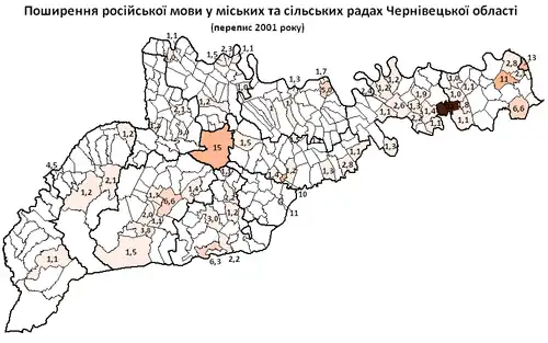 Русские на территории Черновицкой области являлись самым крупным этносом лишь в двух сёлах — Грубной и Белой Кринице. В целом русское население области разделяют на старообрядцев-липован и русских, переселившихся в область после присоединения к СССР. По переписи 2001 года, русский язык родным назвали 5,3 % населения Черновицкой области.