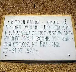 Мемориальная доска на могиле 28 русских солдат из лейб-гвардии Московского полка, погибших при пересечении пролива Арабакашка с 25 по 31 декабря 1877 года. | В този район — двора на Основно училище Отец Паисий в с. Врачеш са погребани загиналите руски войни при зимния преход на Балкана 25 — 31 XII 1877 г. | Врачеш. Воины похоронены во дворе начальной школы им. Отца Паисия в местечке Кривия дол