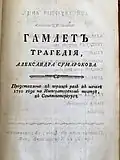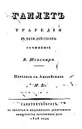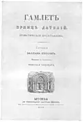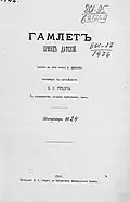 | 10 | 1892 | Пётр Гнедич | «Гамлет, принц Датский»[34] | Первое издание вышло с сокращениями в 1891 году с пометкой «Издание не предназначено для продажи» в количестве 40 экземпляров. | ![]() |