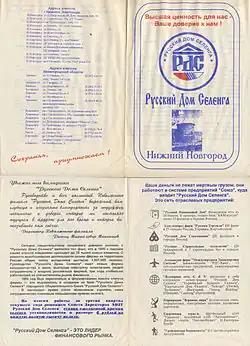 - ↑ ОРГАНИЗАТОРЫ "РУССКОГО ДОМА СЕЛЕНГА" ПОЛУЧИЛИ ПО 9 ЛЕТ КОЛОНИИ. Деловая пресса (8 февраля 2000). Архивировано из оригинала 17 февраля 2020 года.