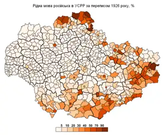 По данным переписи населения, проведённой в 1926 году, русские составляли 9,2 % населения (5,6 % сельского и 25,1 % городского населения), украинцы — 80,1 % (87,5 % сельского и 47,3 % городского населения), евреи — 5,4 % (1,5 % сельского и 22,7 % городского населения). Русский язык родным назвали 15,3 % жителей Украинской ССР в её тогдашних границах, в том числе 8,6 % сельского и 44,6 % городского населения. Украинский язык родным назвали 76,4 % (85,6 % сельского и 36,0 % городского населения). В сельской местности проживали 81,5 % населения, в городской — 18,5 %[32].