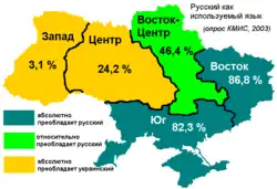 Усилия правительства Украины приносили мало ощутимых краткосрочных результатов, так что фактическое распространение русского языка на Украине за первые 10-15 лет её независимости, по одним данным, не уменьшилось, а по другим, даже увеличилось. Например, в 1989 году на Украине 80 % от общего числа проданных книг составляли книги на русском языке[42], а в 2004 году, если не считать учебники, этот показатель составил 95 %[14]. Фонды библиотек Украины на 60 % состояли из русскоязычной литературы[49]. В тех регионах Украины, где русификация практически приблизилась к 100 %, восстановления украинской среды практически не происходило. Например, в Донецкой области, где последняя украинская школа была закрыта в 1989 году[42], в 2003 году только 4 % учеников обучались на украинском языке[14], а 96 % — на русском. Лишь 2 % фильмов, попавших в прокат на Украине в 2004 году, были на украинском языке[14]. С другой стороны, в области образования наблюдались тенденции к сокращению обучения на русском языке. Например, число детских садов с русским языком обучения снизилось к 2001 году до 22 %, число школ — до 29 %, число студентов, обучающихся на русском языке, — до 22 %[50]. См. также Сужение сферы функционирования русского языка.
