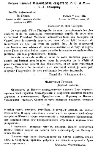 В феврале 1912 года Совет РОЛМ направил известному французскому учёному Камиллу Фламмариону адрес в связи с исполнившимся 50-летним юбилеем его служения великой науке о Вселенной. Фламмарион, как никто из современных мироведам учёных, был близок им по духу, поскольку утверждал, в частности: