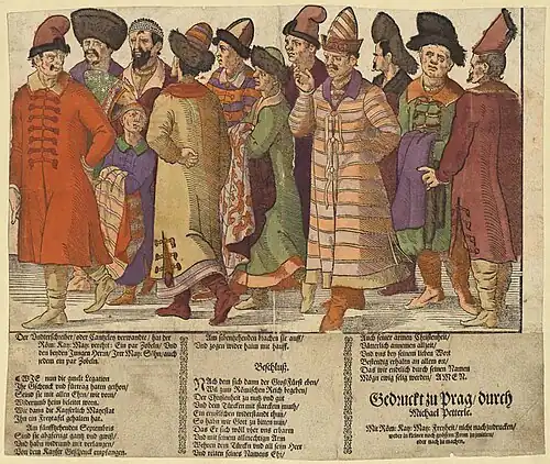 | «Истинное изображение посольства или послов Великого Князя Московского к Его Императорскому Римскому Величеству; также в каких одеждах и в каком виде каждый явился ко двору, когда они Его Императорскому Римскому Величеству представили верющую грамоту и подарки, в Регенсбурге, на нынешнем имперском сейме, 18 июля настоящего 1576 года»[10] | |||||