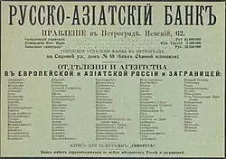 - ↑ Высочайше утвержденное положение Совета министров «Об учреждении акционерного коммерческого банка под наименованием: «Русско-Азиатский Банк» // Полное собрание законов Российской империи, собрание третье. — СПб.: Государственная типография, 1913. — Т. XXX, отделение I, 1910, № 33788. — С. 787—789. Архивировано 29 ноября 2014 года.