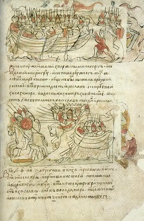 ![]() Радзивиловская летопись лист 186, Русско-византийская война 1043 года: «В год 6551 (1043). Послал Ярослав сына своего Владимира на греков и дал ему много воинов, а воеводство поручил Вышате, отцу Яня. И отправился Владимир в ладьях, и приплыл к Дунаю, и направился к Царьграду. И была буря велика, и разбила корабли русских, и княжеский корабль разбил ветер, и взял князя в корабль Иван Творимирич, воевода Ярослава. Прочих же воинов Владимировых, числом до 6000, выбросило на берег, и, когда они захотели было пойти на Русь, никто не пошел с ними из дружины княжеской. И сказал Вышата: "Я пойду с ними". И высадился к ним с корабля, и сказал: "Если буду жив, то с ними, если погибну, то с дружиной". И пошли, намереваясь дойти до Руси. И сообщили грекам, что море разбило ладьи руси, и послал царь, именем Мономах, за русью 14 ладей. Владимир же, увидев с дружиною своею, что идут за ними, повернув, разбил ладьи греческие и возвратился на Русь, сев на корабли свои» | |||