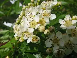 Соцветие — сложный щиток, 5—10 см в поперечнике, ветви его и цветоножки с редкими рыжеватыми волосками. Цветки около 12 мм в поперечнике, красноватые или белые. Чашелистики дельтовидные, прямые, цельные, лишь по краю слегка пушистые. Лепестки красноватые или белые, сверху голые. Завязь не густо войлочная, серая. Прицветники рано опадают, узколинейные, ржавого цвета, шерстистые. Плоды сочные, ярко-красные, эллиптические, округлые или продолговатые, кислые, но приятного вкуса, чрезвычайно обильные, у незрелых — слегка расходящиеся зубцы чашечки образуют сравнительно крупную коронку. Цветение в июне—июле, плодоношение в сентябре—октябре. Хромосомное число 2n = 34.