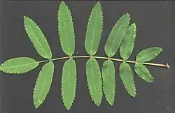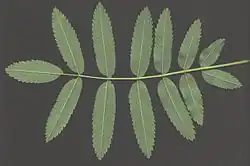 Листья до 20 см длиной, очерёдные, непарноперистосложные, состоят из 7—15 почти сидячих ланцетных или вытянутых, заострённых, зубчатых по краю листочков, цельнокрайных в нижней части и пильчатых в верхней, сверху зелёных, обычно матовых, снизу заметно более бледных, опушённых. Осенью листья окрашиваются в золотистые и красные тона.