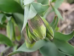 Цветок одиночный (реже их два—три) поникающий. Околоцветник колокольчатый, доли его продолговато-эллиптические, до 30 мм длиной, туповатые, на верхушке реснитчатые. Нижняя часть тёмно-красно-фиолетовая, верхняя ярко-жёлтая; граница между частями резкая. Нектарник глубокий, наружу выдается в виде большого бугорка или даже шпоры. Тычинки с реснитчатыми нитями, покрытыми сосочками, превышающими немного пыльник. Столбик одинаковой величины с завязью, до половины разделён на три рыльца.