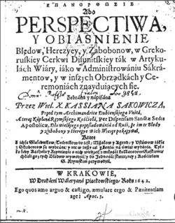 Через два года, в 1644 году, киевский митрополит Пётр Могила издал «Λίθος, или Камень, брошенный с пращи истины св. православной Русской Церкви смиренным отцом Евсевием Пименом[6] на сокрушение лживо-тёмной Перспективы… Кассиана Саковича»[7][8].