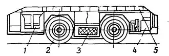Самоходный вагон (см. рис.) состоит из механизма управления 1, ходовой части 2, аккумуляторной батареи 3. привода 4 и кузова 5 (для мягких пород) оборудованного двухцепным конвейером. Крупнокусковую, абразивную, тяжёлую руду и породу перевозят вагонами с откидывающимся кузовом. Ходовая часть таких машин оснащена пневматическими шинами низкого давления с гидравлическим двусторонним управлением всех колёс.
