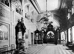 Убранство храма украсили, в том числе, иконы и религиозная живопись таких мастеров как М.П. Клодт, М.Л. Щербаков, М.Е. Малышев, Е.Е. Волков, В.П. Худояров. Известно, что эскиз образа Спаса Нерукотворного для новой домовой церкви разработал сам И.Е. Репин, а В.М. Васнецов передал копию своей известной «Божией Матери с Предвечным Младенцем», оригинал которой находился во Владимирском соборе в Киеве. Храм был украшен резным одноярусным иконостасом по рисункам И.П. Ропета[9].