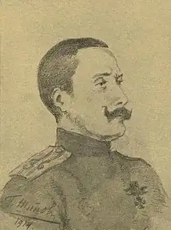 За то, что 6 октября 1914 г., командуя 4-м баталионом, переправился на понтонах у с. Высоцко через р. Сан и занял позицию на неприятельском берегу в 500 шагах от противника, с рассветом атаковал значительно превосходные силы противника и под жестоким артиллерийским, ружейным и пулеметным огнём, выбил его штыками из двух рядов окопов, причем захватил два пулемета и 300 человек пленных, прочно утвердился на неприятельском берегу и тем обеспечил другим частям переправу на левый берег р. Сана.