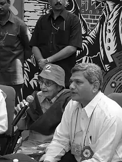 Лакшми Сахгал (слева внизу) в 2005 году с членом политбюро ЦК КПИ (марксистской) Ситарамом Ечури на пресс-конференции