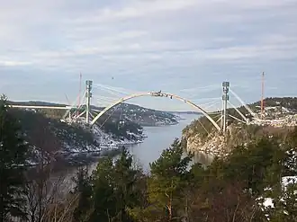 Пролётное строение представляет собой две стальные балки коробчатого сечения, опирающиеся на железобетонную арку со стрелой подъёма над фьордом 60 м. Подмостовый габарит с размерами 55×70 м обеспечивает проход судов стандартных размеров. Сооружены четыре мостовые опоры на шведской стороне в зоне прибрежного моста и один устой на норвежском берегу.