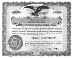 В своей книге Кембрю Маклауд обсуждает концепцию свободы выражения мнений в отношении культурных норм и то, каким образом общество позволяет корпорациям влиять на мнение людей[8]. Маклауд обсуждает собственные шалости, такие, например, как регистрация им в 1998 году фразы «Свобода выражения» в качестве товарного знака в США[8][9][10][11], и заявление, что он возбудит иск против лиц, которые впоследствии используют эту фразу без его разрешения. Маклауд сказал, что „если бы ACLU захотел бы выпустить журнал с названием «Свобода выражения», им пришлось бы заплатить мне гонорар“[12]. После того как телекоммуникационная компания AT&T использовала эту фразу во время маркетинговой кампании, адвокат Маклауда отправил письмо с просьбой о прекращении использования его торговой марки[8]. В своей книге «Владение культурой: авторство, собственность и права интеллектуальной собственности» Маклауд сказал, что целью регистрации товарного знака «Свобода выражения» было вызвать социальный отклик в СМИ[11]. Впоследствии фраза вернулась в общественное достояние[9].