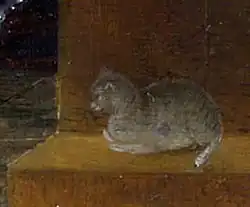 Вероятно, сходную (и, возможно, также двойственную) символику имеет и изображённая слева кошка. Ввиду её способности ловить мышей она иногда связывалась с дьяволом, уловляющим души[20]. Кроме того, кошка, как и куропатка, считалась исключительно похотливым существом, всячески завлекающим самцов. Поэтому на картине она может выступать как аллегория плотских искушений, от которых Иероним предостерегал Евстохию. С другой стороны, кошка — естественный компаньон учёного-книжника, оберегающий его фолианты от порчи мышами[21].