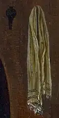 В подобное прочтение вписываются и остальные предметы, изображённые на картине, такие как висящее на стене слева полотенце. Оно могло бы символизировать чистоту Девы — но на нём слишком хорошо заметны нарисованные художником пятна[18]. Поэтому, как и всё, что расположено слева, полотенце символизирует, скорее, утрату чистоты. Рядом с ним на стене висит небольшая лампа, но в этой лампе не горит огонь. Это должно напомнить зрителю притчу о мудрых и неразумных девах, которую цитирует в своём письме Иероним. Он подразумевает, что просто хранить девственность недостаточно, нужно и в помыслах всячески бороться с соблазном, чтобы остаться достойной небесного Жениха[20].