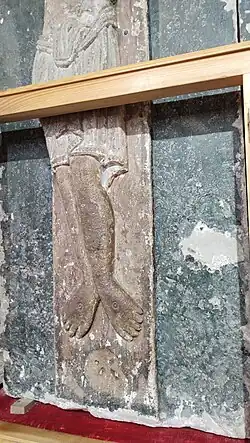 Вагнер считал, что Распятие находилось в центральной закомаре северного фасада собора, на котором располагались «важнейшие патрональные рельефы», ктиторский портрет самого князя Святослава (также в Троицком приделе у северо-восточного угла храма позднее находилась и гробница князя)[103]. Вагнер дополнял сохранившуюся композицию Святославова креста двумя взволнованными ангелами и изображением серафима над гетимасией (при этом исследователь писал, что делает это условно, так как аргументов в поддержку последнего утверждения явно недостаточно), что увеличивало высоту композиции до 2,18 м[104].