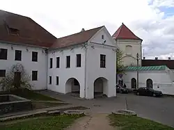 Монастырский корпус соединён с церковью Святого Духа крытой галереей, идущей вдоль зубчатой стены в виде аркады, разделённой лопастями на проёмы. В месте примыкания стены к монастырского здания располагаются трёхпролётные ворота с широким центральным проходом и двумя узкими боковыми арками. Галерея была прорезана маленькими окнами, которые во время обороны можно было использовать как бойницы.