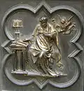 Ворота повторяют композицию южных дверей баптистерия, ранее сделанных Андреа Пизано — 28 небольших рельефов заключены в обрамления готической формы — квадрифолии (четырёхлистники) и расположены в семь рядов по четыре, по два на каждой створке. На них представлены сцены из Нового завета, начиная с Благовещения и заканчивая Святой Троицей. Изображения читаются снизу вверх и слева направо, начиная с нижнего третьего ряда. Такое расположение было выбрано не случайно, а по мере нарастания драматичности сюжетов.