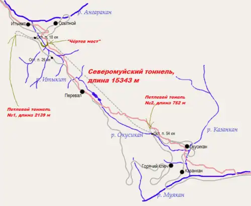 На восточном склоне перевала дорога делает, постепенно опускаясь, три огромные петли, ниже которых на 49-м км расположена станция Горячий ключ. Далее после моста через Окусикан начинается (54-й км) ещё один, более короткий петлевой тоннель №2 длиной 752 м, после которого начинается котловина, в которой у восточного портала Северомуйского тоннеля расположен довольно крупный посёлок Северомуйск.