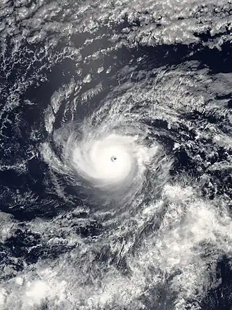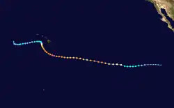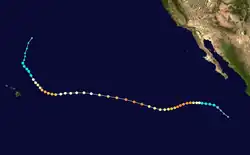 15 августа тропическая депрессия сформировалась из зоны неорганизованных гроз, которые ранее отслеживались NHC[101]. Погодные условия были благоприятны и циклон начал быстро усиливаться: к 18 часам 16 августа он усилился до тропического шторма[102], а к 6 утра 17 сентября — до тропического урагана[103]. Последовавший после этого эффект быстрого усиления тропического циклона привел к тому, что уже утром 18 сентября ураган достиг 4 категории[104], после чего его сила то росла, то ослабевала[105], до тех пор, пока утром 22 августа он не достиг пятой категории[106][107][108]. После этого усиления циклон начал быстро ослабевать из-за сильного сдвига ветра, за шесть часов ураган ослаб до второй категории[109]. К 18 часам 26 августа циклон ослабел до тропической депрессии[110], 27 августа усилился до тропического шторма[111], но через 18 часов снова ослабел до депрессии[112] и к 6 часам утра 29 августа превратился в остаточный минимум[113]. На Гавайях от удара шторма погиб один человек[114], ущерб был оценен в 200 миллионов долларов США.