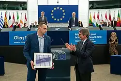 25 октября 2018 года Олег Сенцов был удостоен премии имени Сахарова[94][95][96]. 12 декабря премия была вручена двоюродной сестре Сенцова Наталье Каплан. При вручении премии председатель Европарламента Антонио Таяни заявил, что Сенцов мирно выражал протест против «аннексии Крыма Россией», решительно выступая за демократию и верховенство права. За это он был осуждён в России по политическим причинам, подчеркнул Таяни[97].