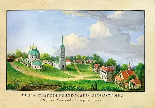 Но Сергий был теперь не одинок в своём начинании. Кроме Злобина, его идею поддерживали влиятельные вольские купцы Василий Епифанов, Пётр Сапожников, шурин Злобина Пётр Волковойнов и другие менее значительные вольские граждане. Его пропаганда наделала много шума: «Видяще в нём отцы духовное разстройство, убояшася, да не како в зрелую пшеницу его плевелы вместятся и могут повредити препростых душ спасению и отвести от правого пути к иному, его же не предаша отцы наши»[59]. Сложилась и противная партия из Прохора Калмыкова, его соратника Сергия Сыртовского, жены Василия Злобина Пелагеи, ревностной раскольницы и ещё одного видного купца Ивана Расторгуева, и в 1795 году ей удалось добиться отстранения Сергия.