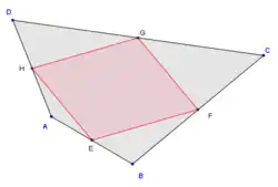 В силу теоремы Вариньона серединный четырёхугольник всегда является параллелограммом, который называется вариньоновым. Если четырёхугольник является простым, то площадь параллелограмма равна половине площади исходного четырёхугольника. Периметр параллелограмма равен сумме диагоналей исходного четырёхугольника.