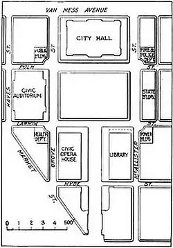 Муниципальный Центр был построен в начале XX века после того, как городская ратуша была уничтожена во время землетрясения 1906 года и пожара, последовавшего за ним. Хотя архитектор и градостроитель Даниел Хадсон Бёрнем предоставил городу планы Муниципального Центра в стиле архитектуры неоклассицизма незадолго до землетрясения 1906 года,[5] его планы так и не были превращены в жизнь. План Бёрнема предусматривал создание большой полукруглой площади на пересечении улиц Маркет и Ван-Несс в качестве узла, соединяющего административные здания с вышеуказанными улицами.[6]:10–11