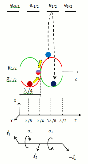 Предположим, что в момент включения лазерного излучения атомы, движущиеся вдоль оси OZ находятся в точке λ/8. В этой точке лево-поляризованый свет вызовет вынужденные переходы атома между уровнями и . Время жизни атома в возбуждённом состоянии для щелочных металлов ≈ 30 нс, после этого произойдёт спонтанное возвращение атома на исходный или другой (в соответствии с правилами отбора) уровень. В рассматриваемом случае среди возможных путей распада есть такой, который приведет к потере энергии, а именно: .