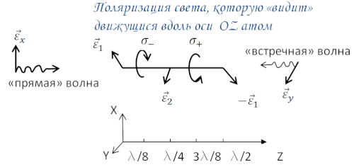 Когда в атомном паре распространяются две линейно поляризованные волны, ортогональные к друг другу и движущиеся навстречу друг другу, атом видит суммарную поляризацию с весьма своеобразным поведением, см. Рис. 3.