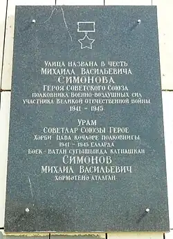 - 7 мая 2005 года на могиле М. В. Симонова был торжественно открыт памятник. На гранитной стеле изображён лётчик-герой в парадном мундире со всеми наградами, на постаменте помещена надпись: «Герои уходят, а память о них вечна»[13].