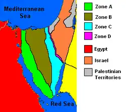 - Зона B: Между линией А и линией B. Египетским батальонам пограничной безопасности разрешено оказывать поддержку гражданской полиции в зоне B.
