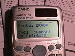 В информатике, синтаксическая ошибка относится к ошибке в синтаксисе последовательности символов или токенов, которая записана на определенном языке программирования.[1]