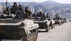 1 июня 1976 года сирийская армия вторглась в Ливан. Вскоре в Ливане было уже 12 тыс. сирийских военнослужащих (несколько бригад из состава танковой и механизированной дивизий). Однако сирийские войска выступили не на стороне палестинцев и НПС, а против них. 6 июня 1976 года в западной части долины Бекаа произошли столкновения между сирийскими войсками и располагавшимися там отрядами палестинцев и НПС. В итоге сирийские войска захватили значительную часть долины Бекаа, окрестности портовых городов Триполи и Сайда, а также бейрутский международный аэропорт, а военно-морские силы Сирии блокировали с моря районы, подконтрольные ливанским левым силам.