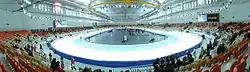 Стандартный 400-метровый овальный конькобежный стадион с двумя дорожками. 8000 мест для зрителей.