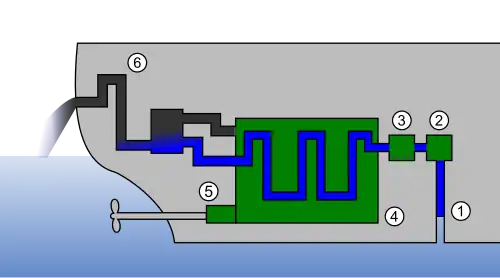 Классическая система охлаждения поршневого ДВС, где теплота от стенок камеры сгорания отводится в охлаждающую жидкость или воду, и затем рассеивается в воздухе радиатором1 - водяная рубашка цилиндра2 - термостат3 - радиатор4 - вентилятор5 - центробежный насос охлаждающей жидкости/воды